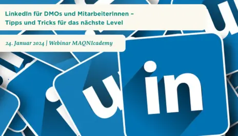 Webinar "LinkedIn für DMOs und MitarbeiterInnen – Tipps und Tricks für das nächste Level" Kristin Koch | November 2023 Neuer Impuls der Webinar-Reihe MAQNIcademy am Mittwoch, den 24.01.2024.