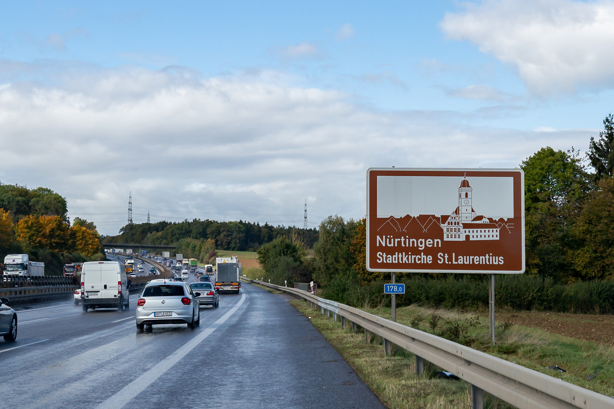 Die braun auf weiß stilisierte „Burg Teck“ auf dem Schild an der A 8 sieht interessant aus. Aber gibt es dort auch eine Gastronomie, oder ist sie vielleicht nur eine Ruine? Die Wahrscheinlichkeit, dass jemand, der noch nie von der Teck gehört hat, von 120 Stundenkilometern auf 60 drosselt und die nächste Abfahrt zur Burg nimmt, dürfte eher gering sein. Umso weniger, als häufig nicht zu erkennen ist, welche Abfahrt zu der Sehenswürdigkeit hinführt.