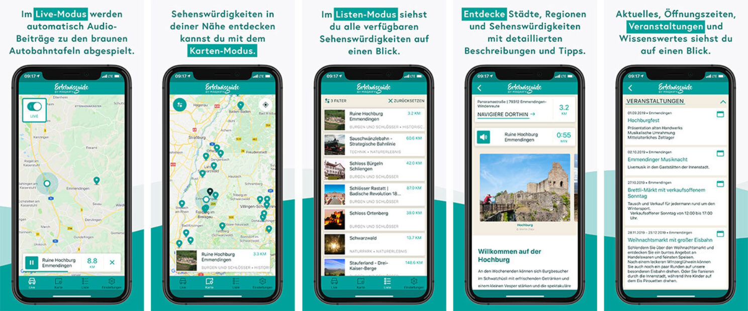 Diese Aufgabe übernimmt die neue App „Erlebnisguide“ von MAQNIFY – zunächst für alle Autobahnhinweistafeln in Baden-Württemberg. Nutzern bietet die App kurzweilige Hörerlebnisse und weiterführende Informationen. Teilnehmenden Partnern ermöglicht die App, auf die Besonderheiten ihrer Destination aufmerksam zu machen.