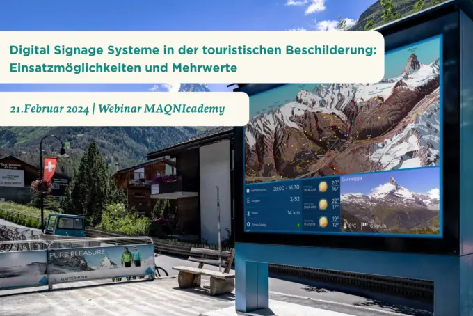 MAQNIFY bietet mit der Webinar-Reihe "MAQNIcademy – Wissen kostenlos, aber nicht umsonst“ den nächsten Impuls zum Thema „Digital Signage Systeme in der touristischen Beschilderung: Einsatzmöglichkeiten und Mehrwerte für Ihre Destination“ an.